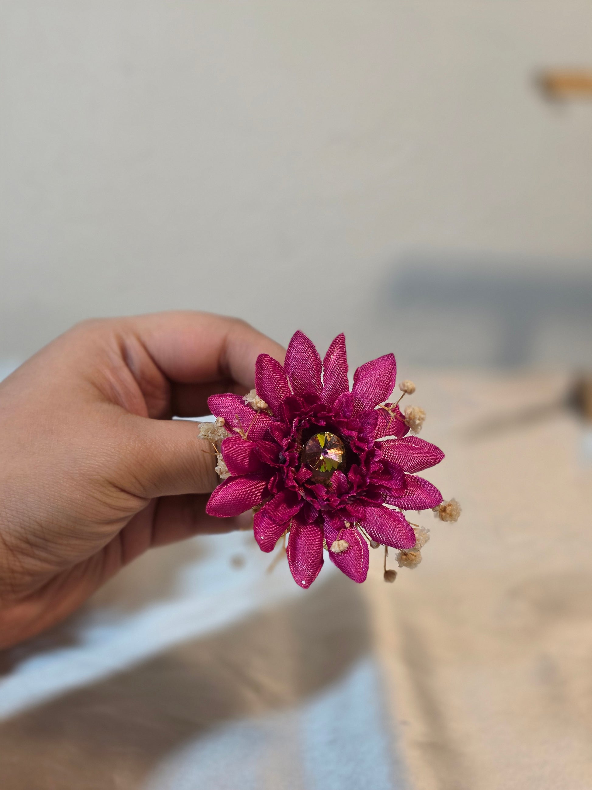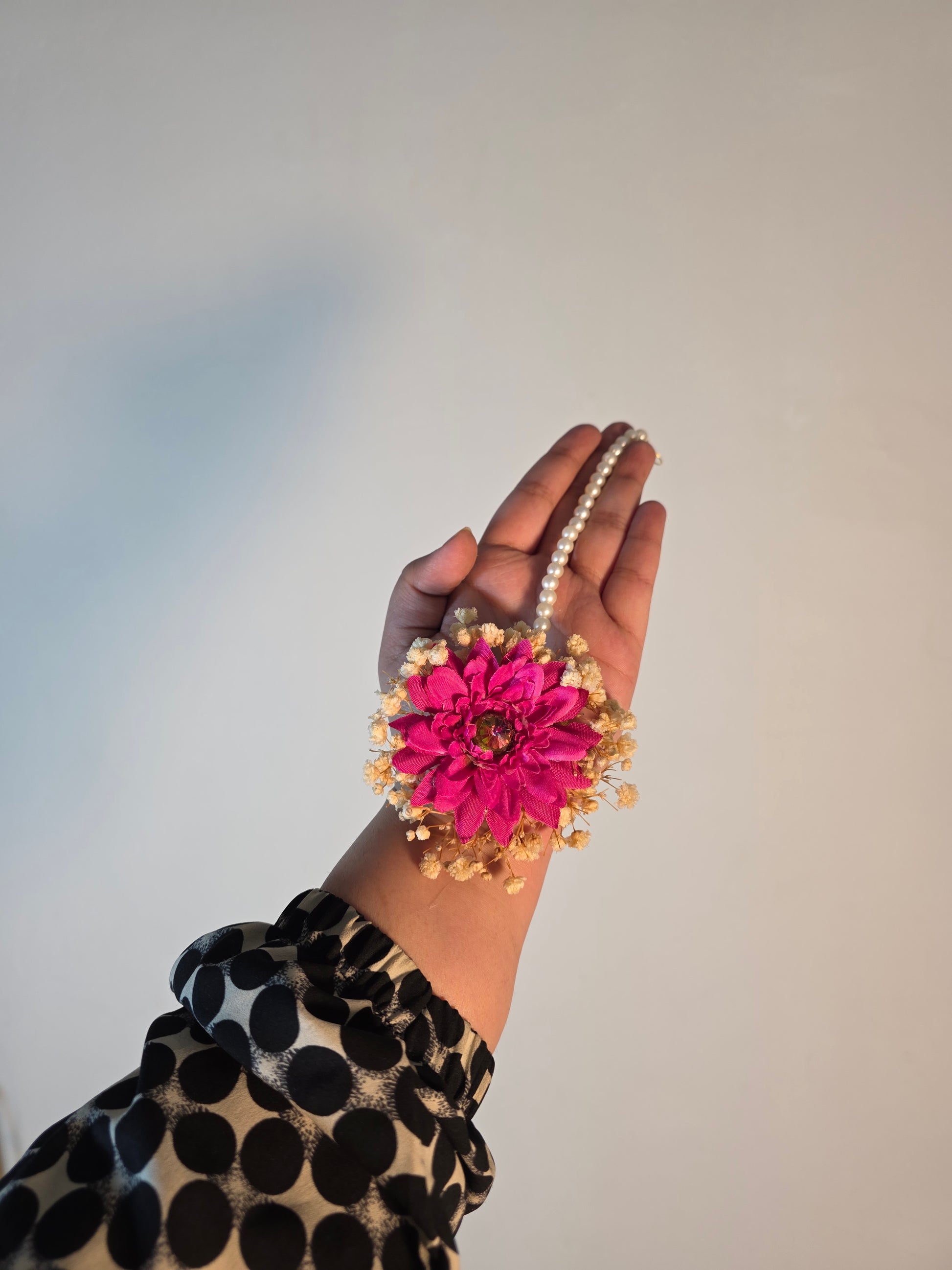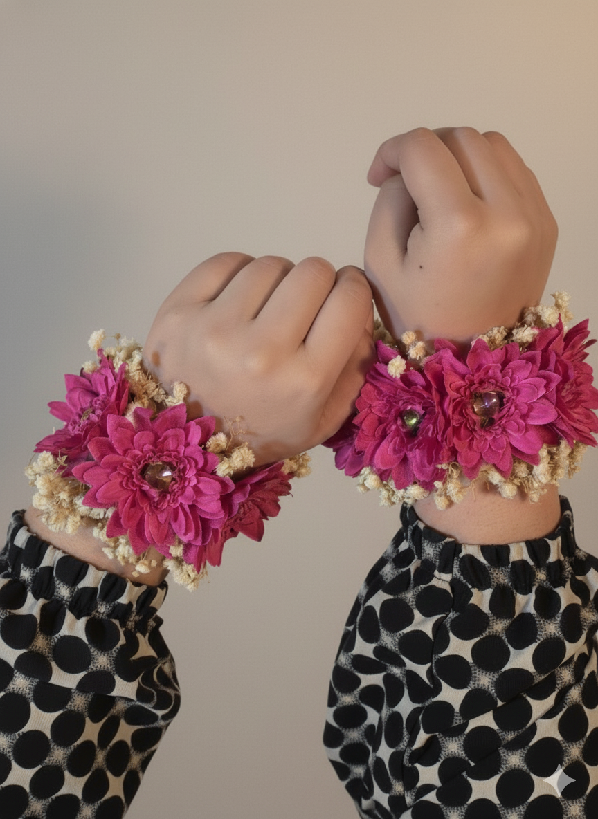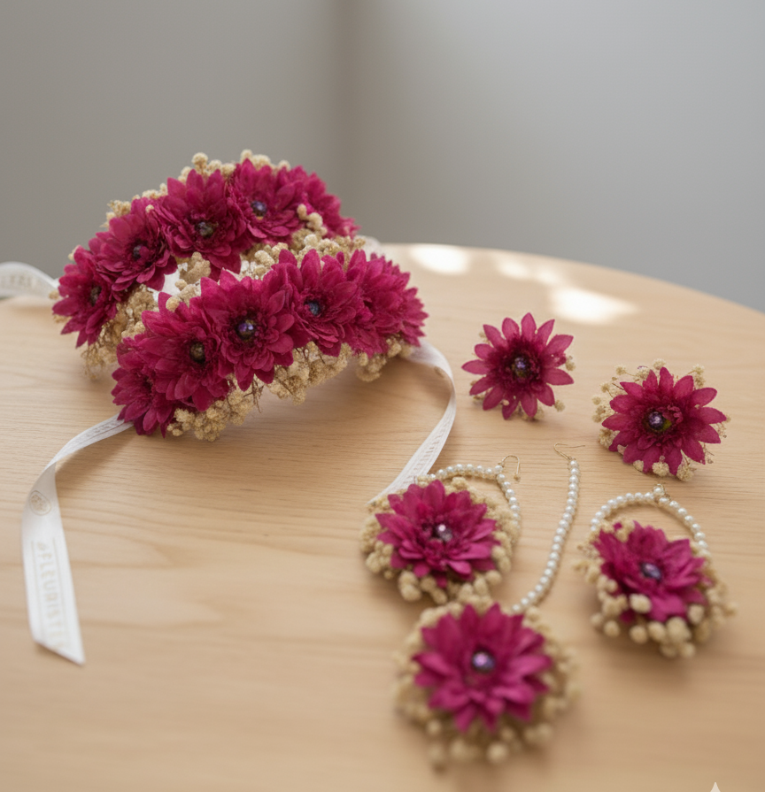 "Aroos-e-gul is a complete set of Most premium quality artificial floral jewelry, including a gajra pair, earrings, ring, and tikka. Made with high-quality artificial flowers and embellished with dry baby breath, stones, and pearls, this set is both beautiful and long-lasting."