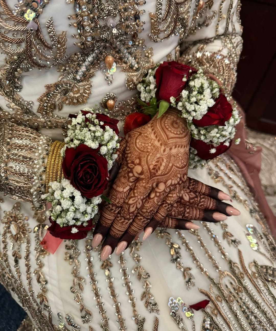 These Bridal Gajras are perfect for nikkah brides, featuring imported red roses and baby's breath. Made with fresh, original flowers, they add an elegant touch to any bridal look. Hand-crafted to perfection, the Gajras provide a traditional and cultural accessory for the bride's special day.