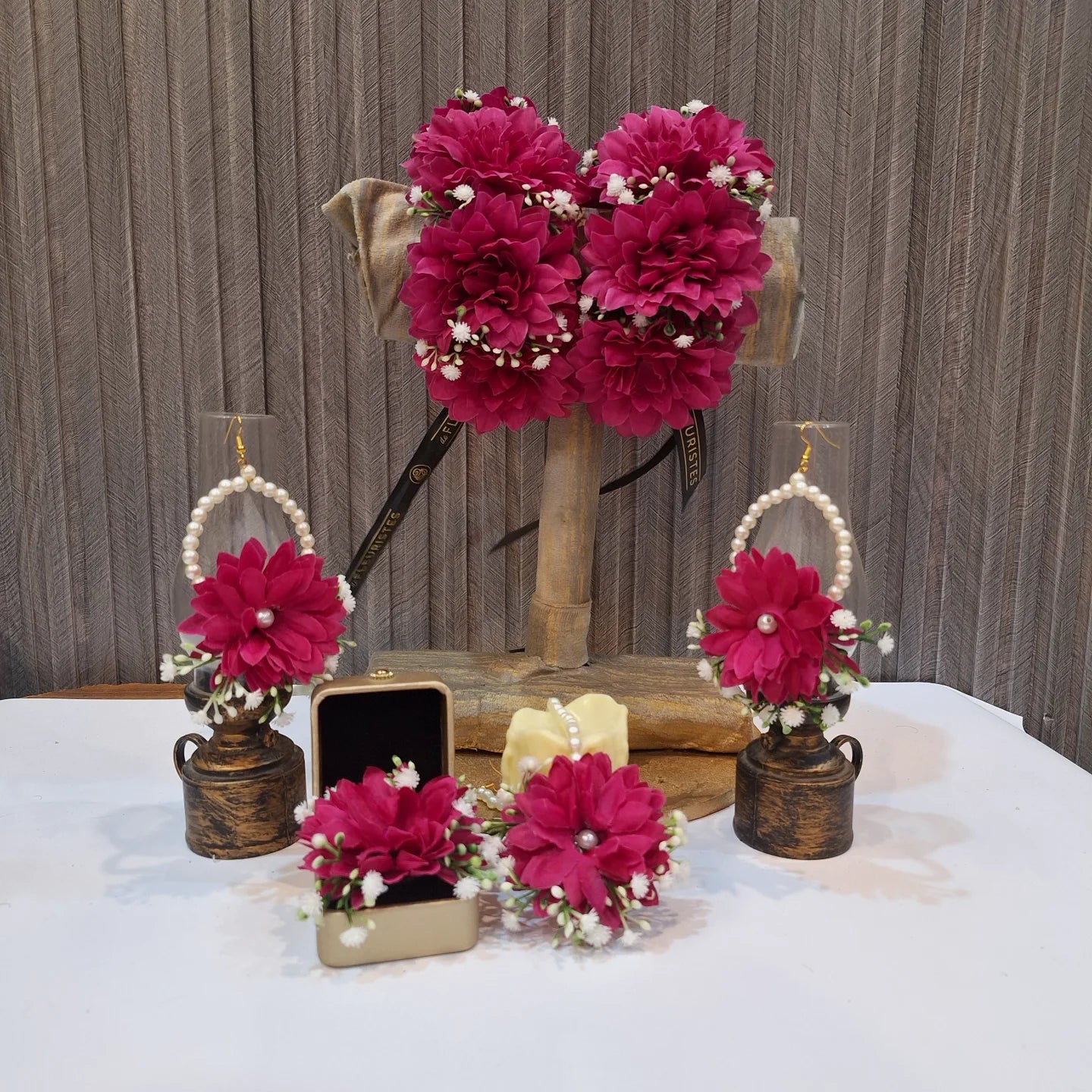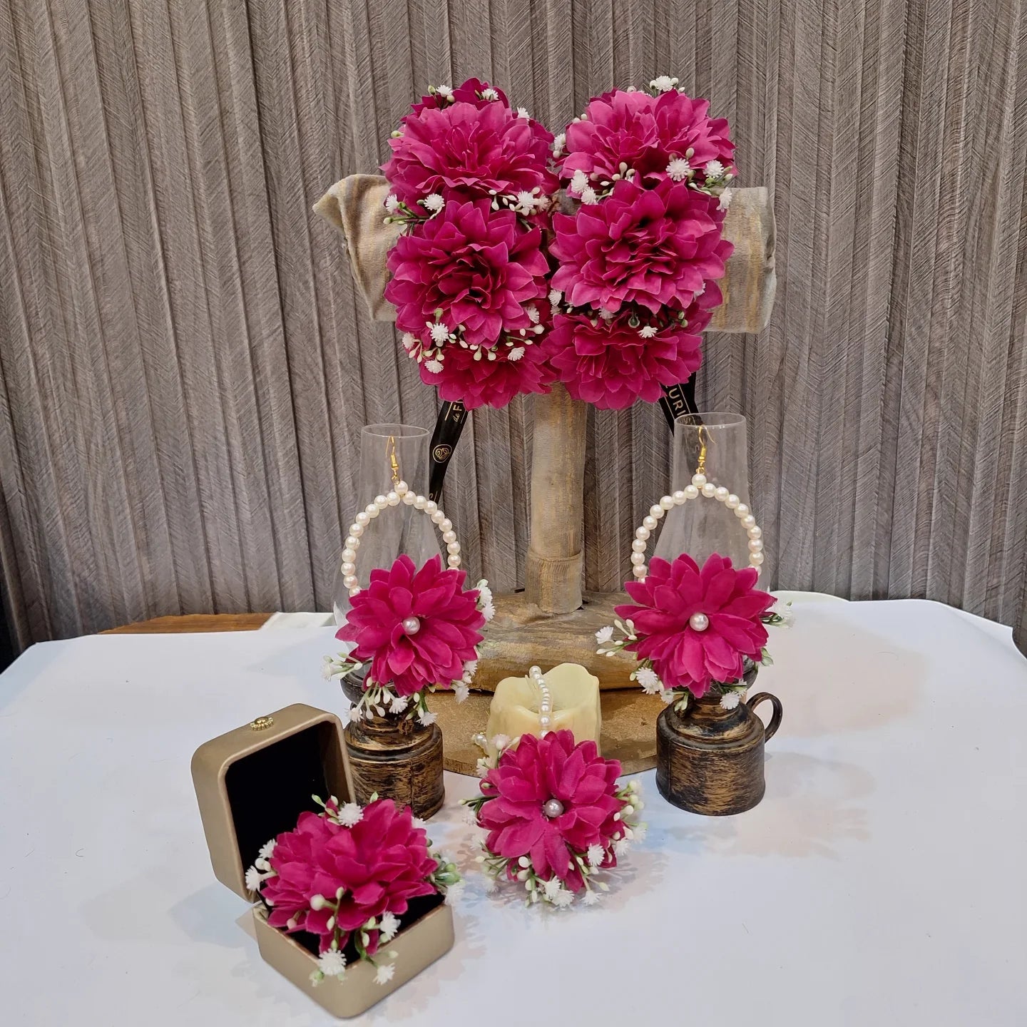 Flora is an artificial jewelry set that includes gajra, pair of earrings, bindi, and a ring. The intricate design and high-quality material make it a perfect addition to any outfit. Bring a touch of elegance and tradition to your look with this stunning set.