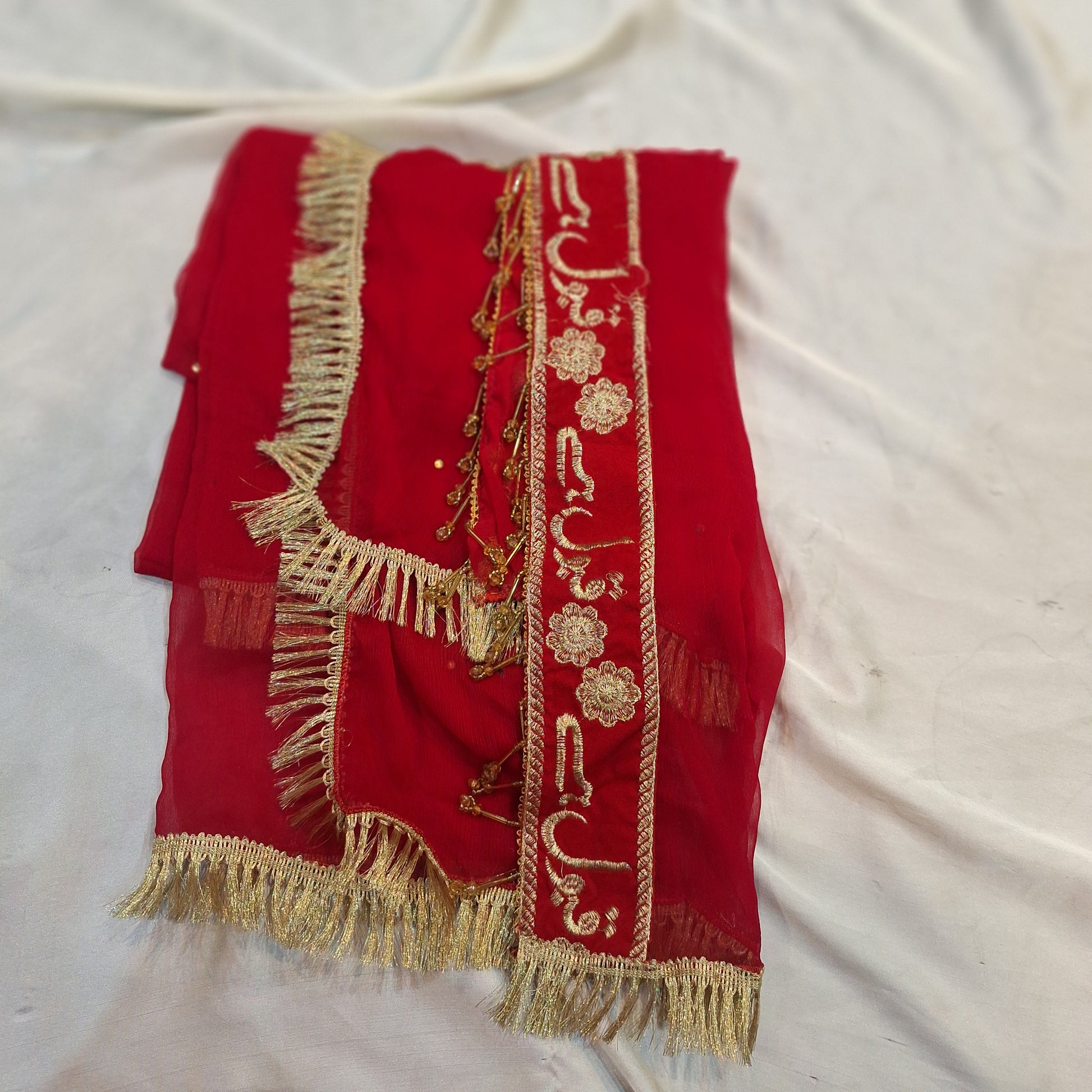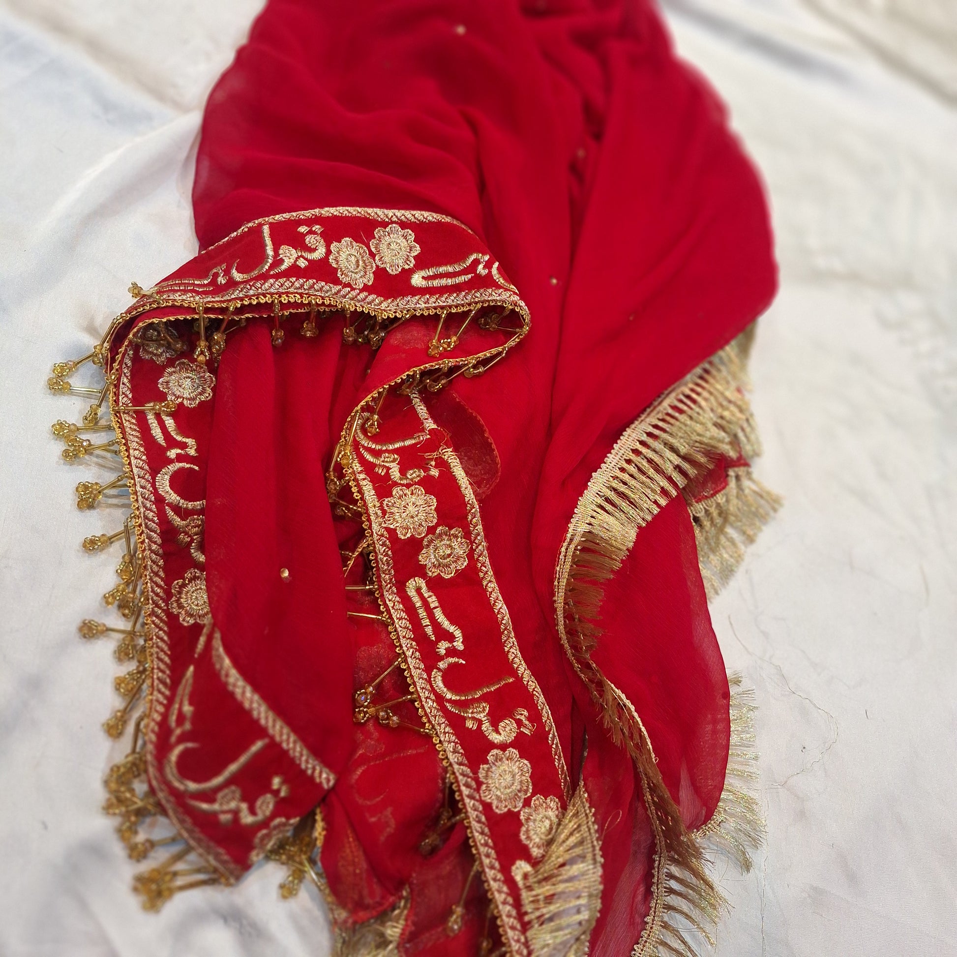 Enhance your nikkah look with our exquisite chiffon duppata. Featuring a front qabool hai lace and a backside adorned with kiran laces, this duppata adds an elegant touch to your outfit. Perfect for completing your nikkah ensemble.