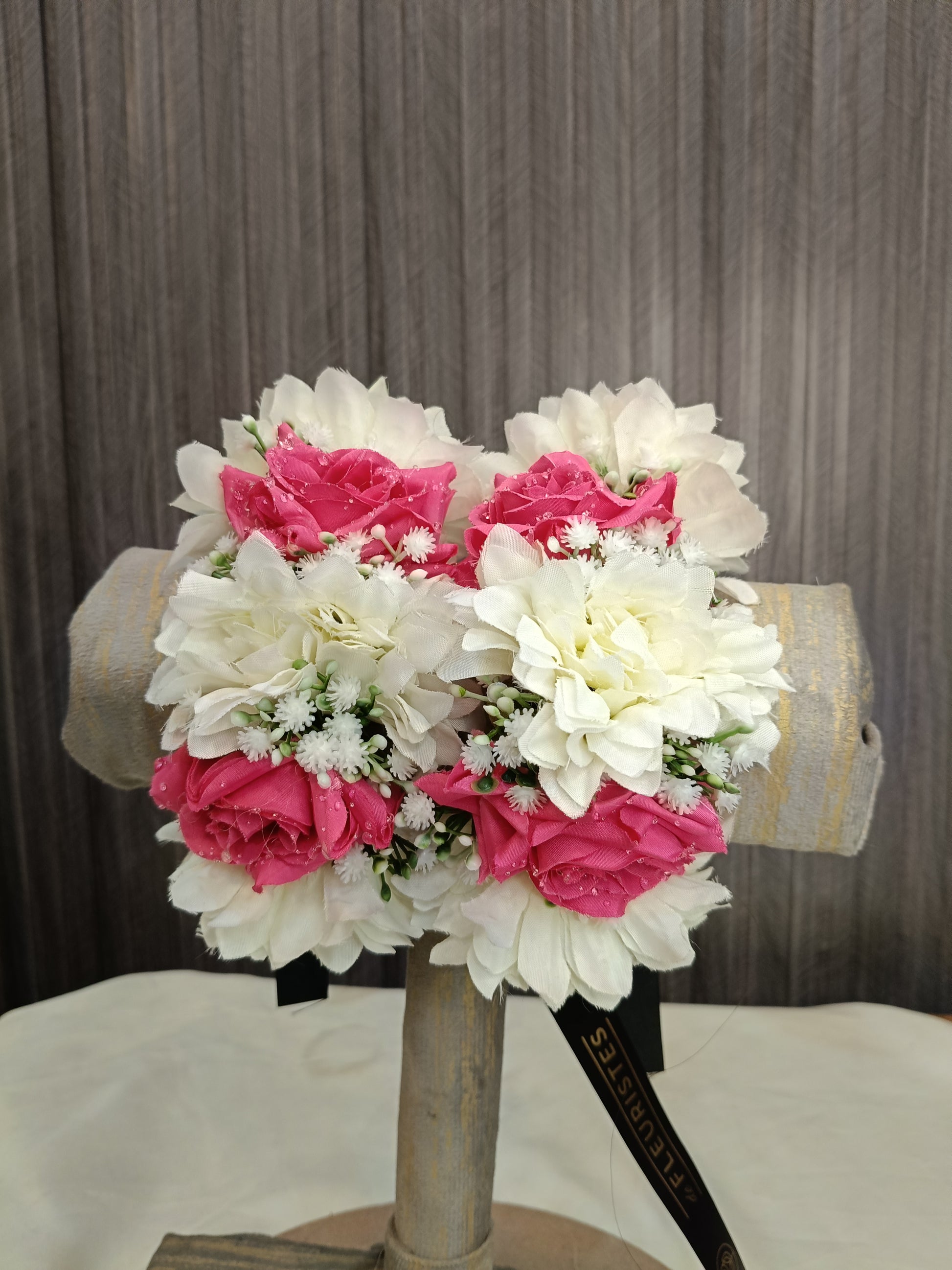 Crafted with premium quality roses, chrysanthemums and baby's breath, this pink and white gajra pair will add a touch of elegance to any nikkah ceremony. The perfect choice for the bride's maid, these gajras are sure to make the bride stand out and feel beautiful on her special day.