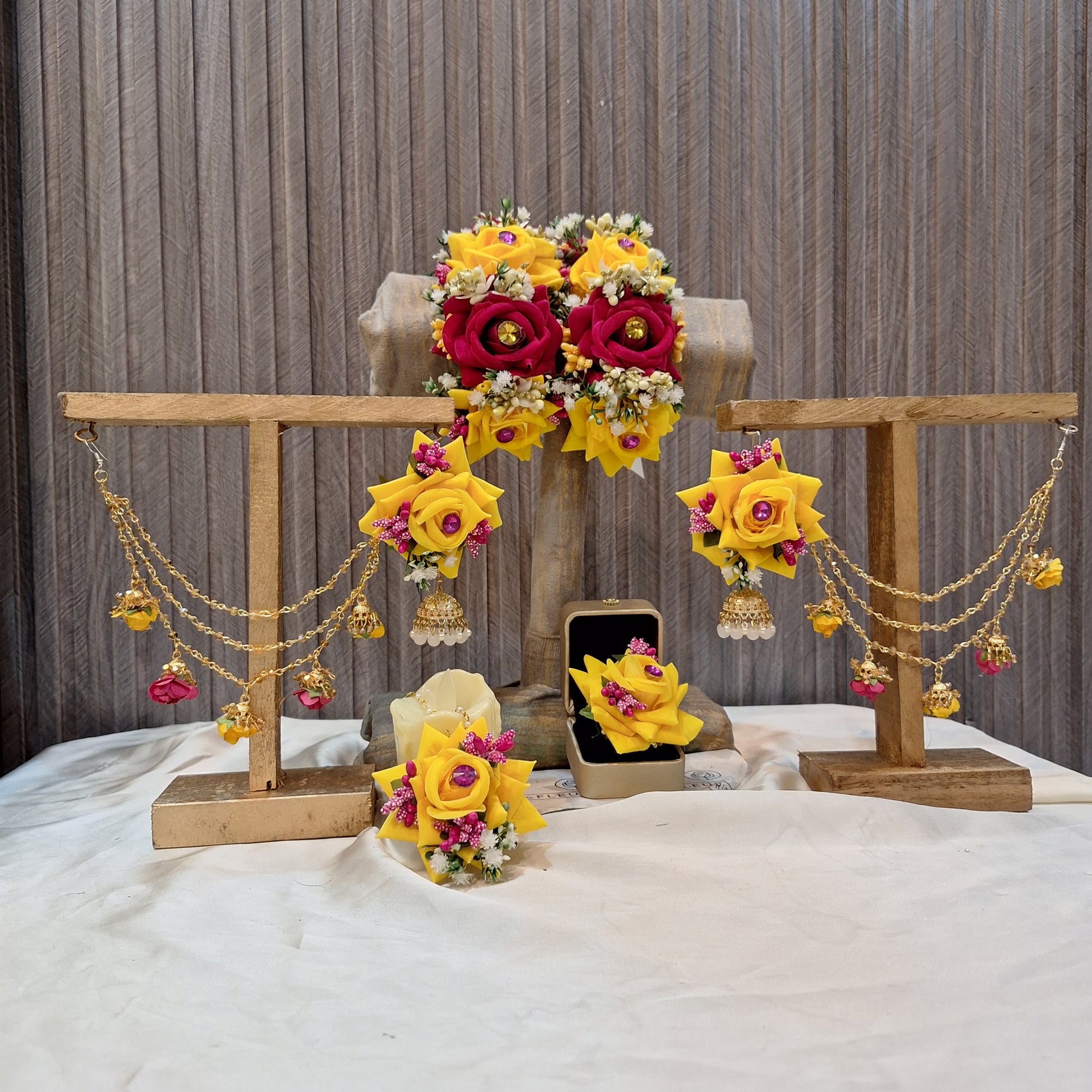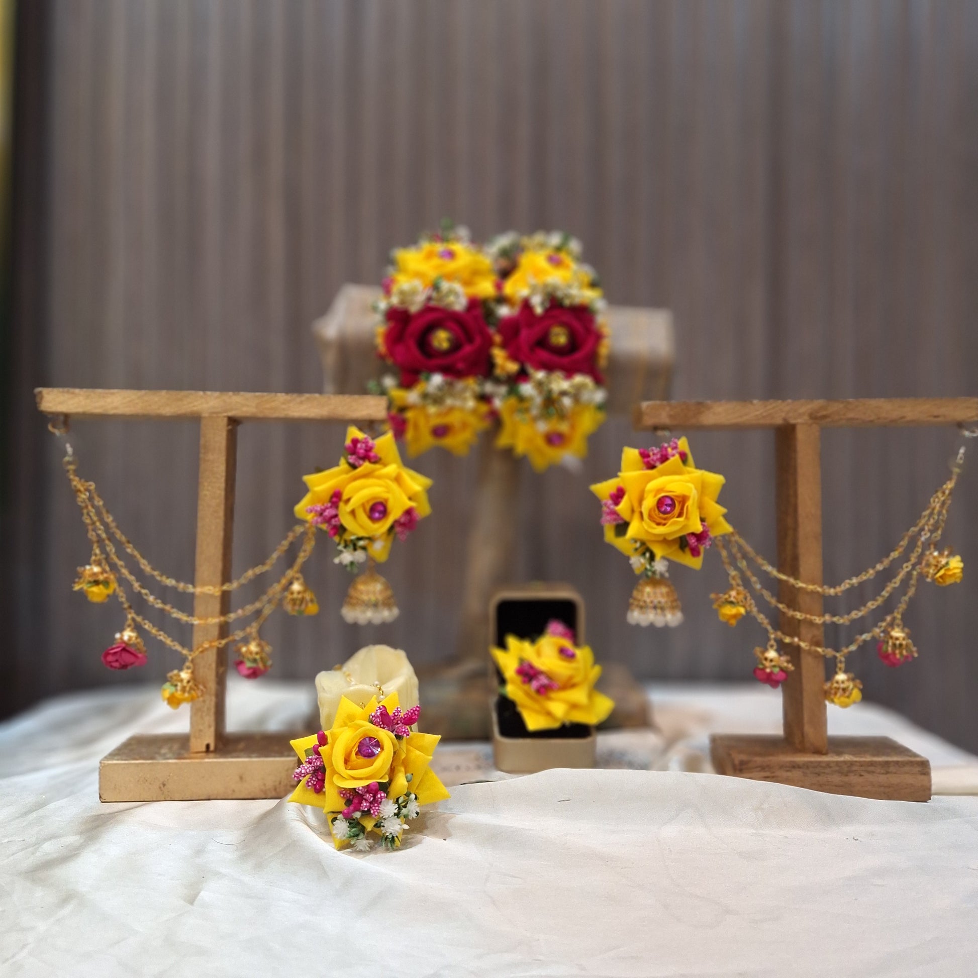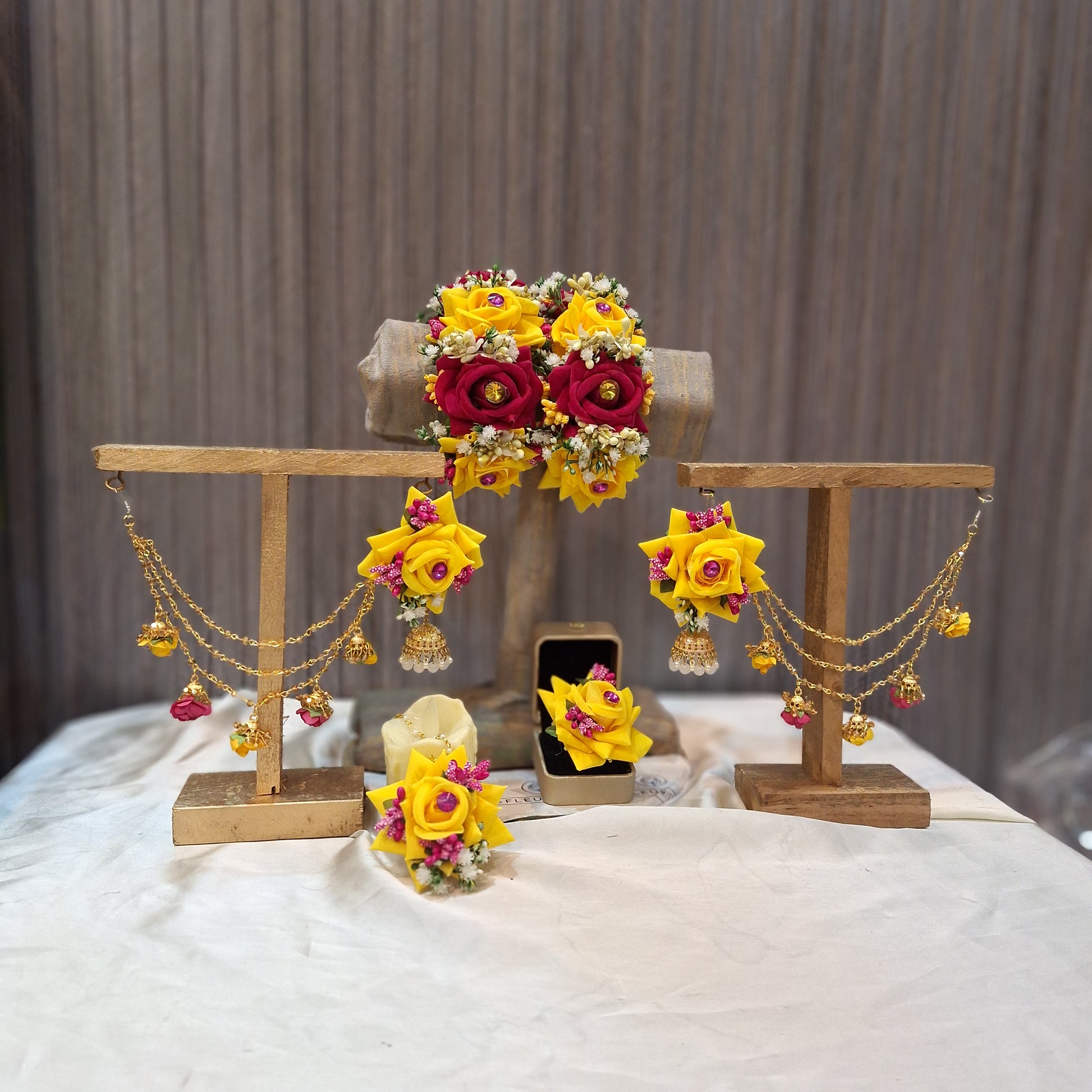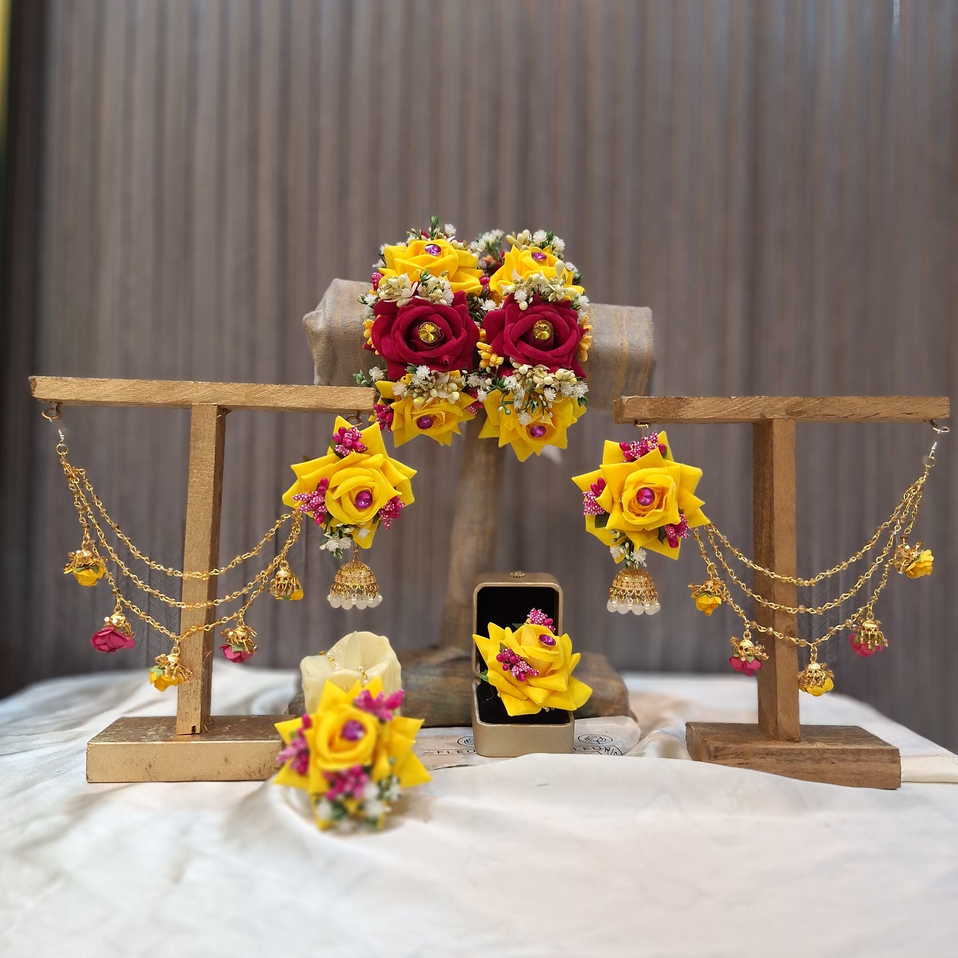 Introducing Roses Glamour- the perfect blend of elegance and convenience. This set includes premium artificial floral jewellery, a gajra pair, earrings with sahary, bindi, and a ring. Save time and hassle with this all-in-one package for a stunning, hassle-free look.