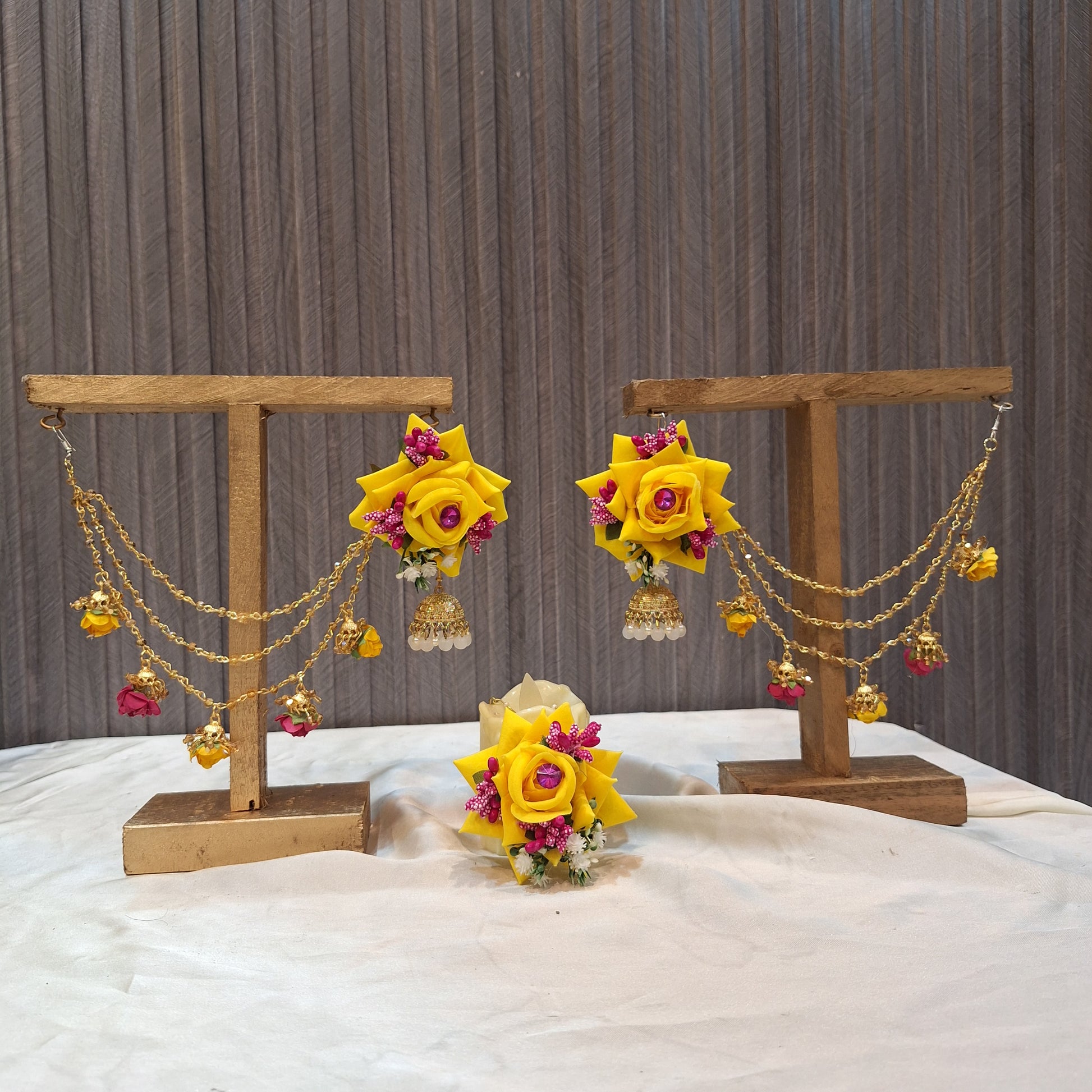 Upgrade your wardrobe with our Yellow Aura Charm. Our premium artificial rose is the perfect accessory to elevate any outfit. Handcrafted with a stunning rose jhumka, sahary, and bindi, this charm will add a touch of elegance and sophistication to your look. Embrace the beauty of this unique piece with expert craftsmanship and exquisite design.
